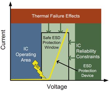 另外,先進的系統(tǒng)級芯片(SoC)設(shè)計都是采用幾何尺寸很小的工藝制造的。為了優(yōu)化功能和芯片尺寸,IC設(shè)計人員一直在不斷減少其設(shè)計的功能的最小尺寸。IC尺寸的縮小導致器件更容易受到ESD電壓的損害。