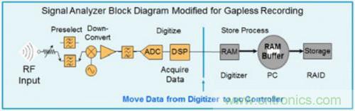 在圖2的示例中,信號(hào)分析儀已被修改為無間斷錄存。圖2中的信號(hào)分析儀與圖1中的一樣,但它包含一條高速數(shù)據(jù)鏈路或總線,使工程師可以將采集到的數(shù)據(jù)從內(nèi)存中移出去。它通過旁路處理和顯示更新,同時(shí)將采集到的數(shù)據(jù)直接寫入采用環(huán)形RAM緩存的最終存儲(chǔ)介質(zhì),來實(shí)現(xiàn)數(shù)據(jù)的無間斷高帶寬錄存。工程師可以在環(huán)形RAM緩存中同時(shí)寫入和讀取數(shù)據(jù)。若在大帶寬下錄存較長時(shí)間的數(shù)據(jù),則需獨(dú)立磁盤冗余陣列(RAID)存儲(chǔ)系統(tǒng)。