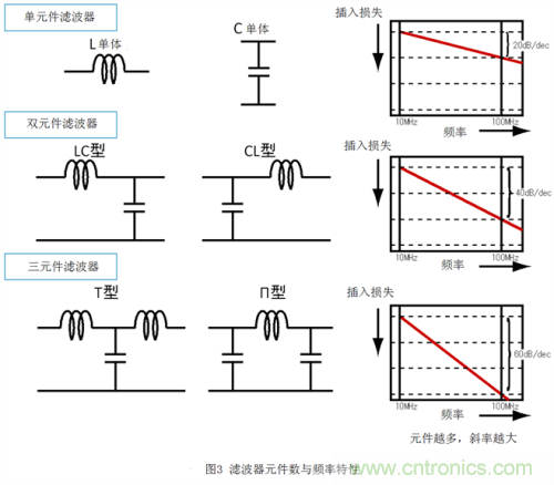 圖 3顯示了組成濾波器的元件數(shù)與濾波器頻率特性之間的關(guān)系。想知道什么是插入損耗,可以看一下圖中各濾波器的信號(hào)衰減量,圖越往下衰減量越多。從圖上我們可 以看到,濾波器中的元件越多,頻率特性的斜率就越大。元件較少的濾波器的頻率特性范圍較窄(斜率較小),衰減頻率及通過(guò)頻率的選擇度較低,有可能導(dǎo)致部分 信號(hào)衰減或者噪聲沒(méi)有徹底去除。另一方面,元件較多的濾波器的頻率特性范圍較寬(斜率較大),頻率的選擇度較高,信號(hào)可以在幾乎不衰減的狀態(tài)下去除噪聲。