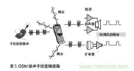 當手機與基站通訊,或兩個手機彼此接近時,發射脈沖通過擴音器,揚聲器,或頭戴式耳機線傳入音頻通路。見圖5,結果是音頻質量大幅降低。
