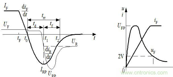 在開關電源中常使用工頻整流二極管、高頻整流二極管、續流二極管等,由于這些二極管都工作在開關狀態,如圖所示,在二極管由阻斷狀態到導通工作過程中,將產生一個很高的電壓尖峰VFP;在二極管由導通狀態到阻斷工作過程中,存在一個反向恢復時間trr,在反向恢復過程中,由于二極管封裝電感及引線電感的存在,將產生一個反向電壓尖峰VRP,由于少子的存儲與復合效應,會產生瞬變的反向恢復電流IRP,這種快速的電流、電壓突變是電磁干擾產生的根源。