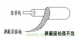 雙絞線、同軸電纜都能有效的抑制電磁干擾。在脈沖信號傳輸線路中常使用雙絞線,控制輔助電源線和傳感器信號線最好用雙絞屏蔽線。因為雙絞線兩根線之間有很小的回路面積,而且雙絞線的每兩個相鄰的回路上感應出的電流具有大小相等、方向相反,產生的磁場相互抵消,這樣就可以減小因輻射引起的差模干擾,不過雙絞線絞合的圈數最好為偶數,且每單位波長所絞合的圈數愈多,消除耦合的效果愈好。使用時注意雙絞線和同軸電纜兩端不能同時接地,只能單端接地,而對屏蔽線,屏蔽層兩端接地能既能屏蔽電場還能屏蔽磁場,單端接地只能屏蔽電場。使用同軸電纜時還要注意,其屏蔽層必須完全包覆信號線接地,即接頭與電纜屏蔽層必須3600搭接,才能有效屏蔽電磁場,如圖4所示,信號線裸露部分仍可以與外界形成互容耦合,降低屏蔽效能。