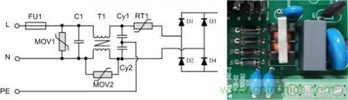 背景:以某型號的電源模塊為例,該模塊是周立功致遠電子為某客戶定制的電源模塊,輸入85VAC~350VAC,且EMC前級電路電路嵌入到模塊中??估擞恳蟛钅k妷?KV,共模電壓6KV。更換更大的保險絲后可承受6KV差模電壓。其前級原理圖及對應實物圖如圖2所示