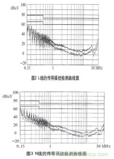 在3m法電波暗室對試驗(yàn)樣機(jī)進(jìn)行測試,其L、N線的傳導(dǎo)騷擾檢測曲線如圖2、3所示,輻射騷擾的垂直極化掃描曲線如圖4、5所示。