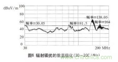 本開關(guān)電源一次通過了傳導(dǎo)騷擾的測試,測試波形如圖2、3所示。輻射騷擾高頻段230~1000MHz也測試合格,如圖5所示。只是在30~200MHz頻段范圍內(nèi)的垂直極化指標(biāo)超標(biāo),最大超標(biāo)20dB,如圖4所示。