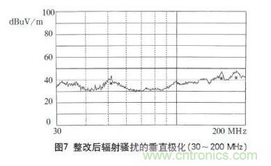 根據(jù)對開關(guān)電源電磁騷擾源的分析可知,在圖1b電路中高頻變壓器T1也是一個(gè)騷擾源。為了阻止高頻變壓器產(chǎn)生的騷擾信號以輻射方式發(fā)射,把變壓器的外殼用屏蔽材料銅箔環(huán)繞一圈構(gòu)成一回路加以屏蔽,以切斷變壓器通過空間耦合形成的輻射騷擾傳播途徑。并且為了減少因變壓器一次側(cè)開通時(shí)電流瞬間突變產(chǎn)生的di/dt騷擾,在變壓器T1的一次側(cè)串進(jìn)1個(gè)電感,以減小器件的開通損耗,降低輻射騷擾信號。經(jīng)過整改后,輻射騷擾大大下降,再次對本電源輻射騷擾進(jìn)行測試,完全達(dá)到了標(biāo)準(zhǔn)要求,其測試結(jié)果如圖7所示。