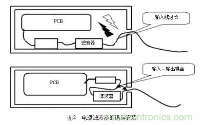 主要考慮(1)抑制工作頻帶以外的干擾;(2)在信號(hào)電路中用吸收濾波器消除無(wú)用的頻譜成分;(3)在電源電路(尤其是開(kāi)關(guān)電源中),操縱電路,控制電路,以及轉(zhuǎn)換電路中消除產(chǎn)生的干擾。在工程實(shí)際中,一個(gè)最值得注意的地方是電源濾波器的安裝,常見(jiàn)的濾波器的錯(cuò)誤安裝如圖2所示。