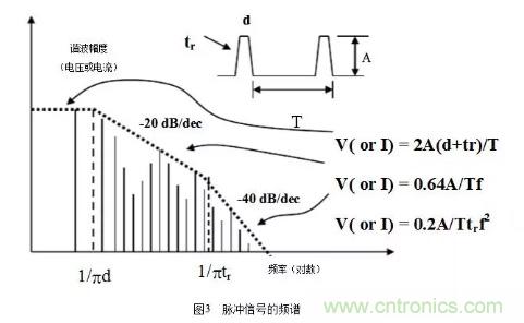 在EMC中,除了基本頻率外,還需考慮諧波因素,通常取十倍頻,但在數(shù)字電路中卻有些不同,比如在時(shí)鐘電路和邏輯門(mén)電路中,輻射帶寬與數(shù)字信號(hào)的上升沿或下降沿有關(guān)系,而不是數(shù)字信號(hào)的重復(fù)周期,其關(guān)系為:rtF?/1max?,其中rt是脈沖的上升沿時(shí)間。例如,典型時(shí)鐘驅(qū)動(dòng)的邊沿速率是2ns,此時(shí),maxF≈160MHz,再考慮十倍頻,則此時(shí)鐘電路可能產(chǎn)生直到1.6GHz的輻射帶寬。所以在選擇器件時(shí)要選擇慢速的邏輯器件系列,因?yàn)槠骷?duì)電磁輻射貢獻(xiàn)的大小與工作頻率無(wú)直接關(guān)系而只取決于邊沿速率(這和從電路功能設(shè)計(jì)上選擇快速器件是矛盾的,在電路設(shè)計(jì)時(shí)需要折中考慮)。還有從器件的抗擾能力上來(lái)說(shuō),CMOS器件是最好的,因?yàn)樗脑肼暼菹薷?。從封裝上來(lái)說(shuō),BGA是最好的,因?yàn)樗囊€很短。脈沖信號(hào)的頻譜如圖3所示。