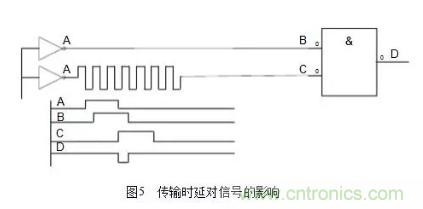 (3)保證信號(hào)在PCB上可靠的傳輸,確保信號(hào)的完整性。這里面主要的問(wèn)題一般包括時(shí)延、阻抗不匹配、地彈跳、串音等。這不但影響到電子器件的穩(wěn)定工作,還會(huì)產(chǎn)生電磁干擾。一般在高速邏輯設(shè)計(jì)中最容易碰到時(shí)延問(wèn)題,處理不好會(huì)產(chǎn)生不希望的脈沖干擾。傳輸時(shí)延對(duì)信號(hào)的影響如圖5所示。