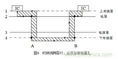 在布線時(shí)盡量少穿過(guò)孔,因?yàn)檫^(guò)孔阻抗和線阻抗不一樣,存在阻抗突變,從而產(chǎn)生駐波使信號(hào)變壞,容易形成輻射,尤其是在時(shí)鐘需要穿層時(shí),要做技術(shù)處理,時(shí)鐘線跨層時(shí)的處理如圖6所示。