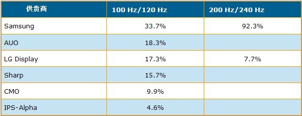 根據DisplaySearch大中華區副總經理謝勤益先生分析,2008年采雙倍頻技術液晶電視面板出貨量已突破10%,由于倍頻技術已被視為解決動態影像模糊的根本方法,同時品牌廠商也積極尋求產品差異化以持續刺激市場需求,因此預估2009年采雙倍頻或四倍頻技術面板出貨將會持續增長,到了今年第四季市占率將分別達到17.1%與4.2%水平。以今年第一季出貨結果來看,采倍頻技術液晶電視面板出貨量達350萬片,市占率為14.3%;其中Samsung領先群雄,出貨量市占率高達33.7%,AUO以18.3%市占率排名第二,其它廠商排名依序為LG Display, Sharp, CMO以及IPS-Alpha。以200Hz/240Hz液晶電視面板而言,目前僅有Samsung與LG Display有量產,同時Samsung以92.3%高市占率幾乎獨霸了該市場。