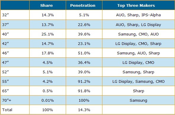 從尺寸別來看第一季雙倍頻液晶電視面板出貨結果,40寸是最主要的出貨尺寸,出貨量比重達25.1%,46寸以17.8%暫居第二,42寸以14.7%市占率排名第三。而采四倍頻技術液晶電視面板出貨則集中在40、46與52寸等較大尺寸面板。