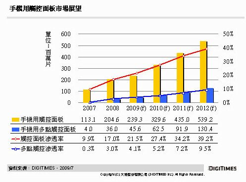 DIGITIMES Research認為,尤其Palm Pre于2009年6月在北美地區上市后,蘋果(Apple) iPhone在北美市場獨占手機多點觸控應用狀況不再,帶動其它廠商陸續推出配備多點觸控功能手機,可望加速拉抬投射電容式觸控面板出貨量。