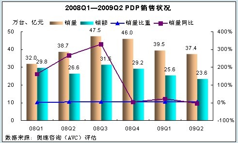 - 2009年上半年等離子電視銷售56.7萬臺(tái),42.1億元,市場份額分別為14.4%和14.5%