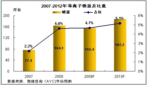 考慮到未來平板電視市場的走勢、結(jié)合等離子上下游產(chǎn)業(yè)情況,奧維咨詢(AVC)預(yù)測:2009年全年等離子銷量為155.4萬臺(tái),與2008年的總量基本持平。2009年下半年,受液晶市場的規(guī)模優(yōu)勢擠壓,第三、四季度等離子電視的銷量因彩電旺季到來將上升至78.6萬臺(tái),但占市場比重將下降至4.3%。