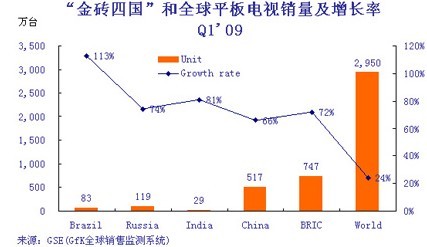• 2009年1季度,金磚四國平板電視銷量為747萬臺,占同期全球市場的25%