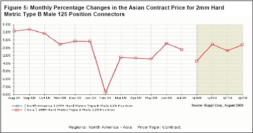 iSuppli公司認為,第二季度訂單比第一季度增長15-16%,出貨量增長7-9%。這種趨勢與其它商品市場一致。但是,連接器領域補充庫存的勢頭不太強。圖5所示為亞洲每月連接器合同價格的百分比變動率,以代表市場趨勢的未來四個季度預測。