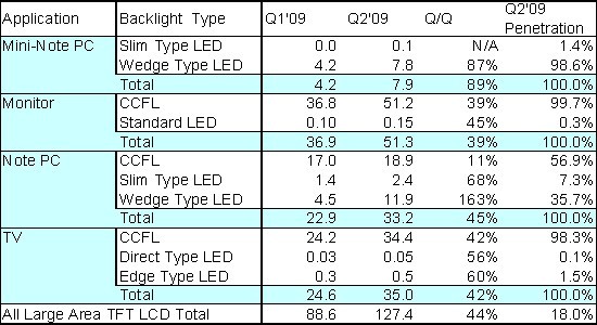 - LED背光源面板在2009年Q2出貨量達2千300萬片,較上一季度大幅成長116%