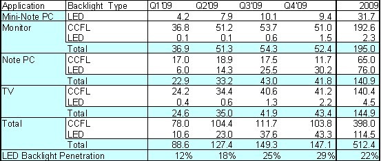 從應用別來看有1千430萬片用在筆記本電腦上,790萬片用在上網本上,60萬片用在電視上,而有10萬片用在桌上型顯示器上。由以下表一顯示2009年第二季 LED背光源面板在各種不同的應用中的滲透率,上網本全數使用LED背光源面板,滲透率為100%;而LED背光源面板占筆記本電腦面板的滲透率為43%,在液晶電視面板的滲透率僅2%,桌上型顯示器面板的滲透率僅0.3%。
