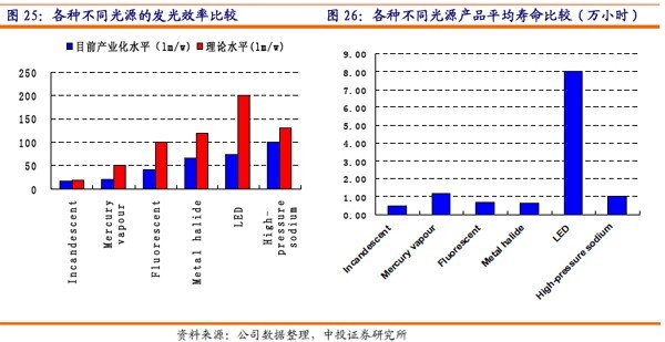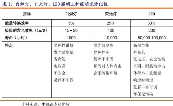 LED燈相對于其他光源有壽命長、發光效率提高空間大的優勢,并且LED燈由于采用物理P-N結的冷發光原理,使得LED燈轉化效率高,也不存在汞燈污染源,被譽為綠色環保的照明能源并不為過。LED燈最高發光率為200流明/瓦,遠高于其他的光源產品;其壽命理論值達到10萬小時,遠遠高于其他光源產品。