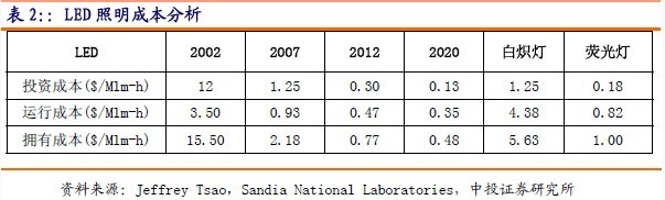 根據美國圣地亞國家實驗室所做的LED照明成本分析,投資成本是將一個燈泡的購買成本(每兆流明)分攤到整個壽命周期,運行成本是指一個燈泡在運行時的成本(每兆流明時),擁有成本是投資成本和運行成本之和,反映了一個燈泡從購買、運行到壽終整個生命周期的總成本。到2010年LED的擁有成本降至0.77美元每兆流明時,將低于熒光燈的1美元每兆流明時,到2020年LED的擁有成本將降至0.48美元每兆流明時,只有熒光燈的一半。