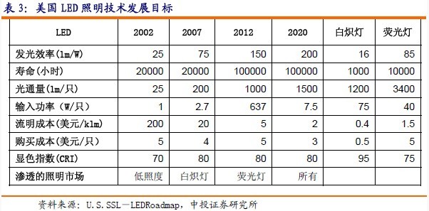 LED照明技術的發展目標是:發光效率將分階段從2002年的25流明/瓦提高到2007年75流明/瓦、2010年的150流明/瓦和2020年的200流明/瓦,發光成本將從2002的200美元/千流明降低到2007年的20美元/千流明、2010年的5美元/千流明和2020年的2美元/千流明。