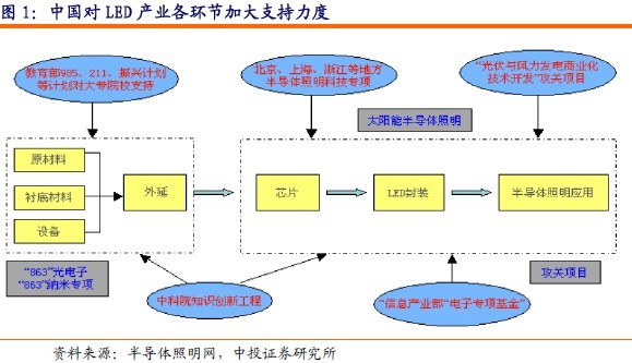 從2005年開始科技部批準了大連、廈門、上海、南昌、深圳等五個半導體照明產業基地,之后在2007年和2008年相繼批準石家莊、揚州等兩個半導體照明產業基地,在政策、稅收和資金上給予長期支持。