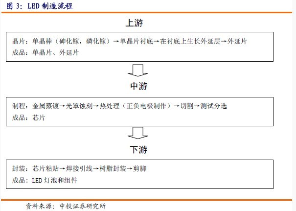LED的制作流程包括上游的單晶片襯底制作、外延晶片生長,中游的芯片、電極制作、切割和測試分選,以及下游的產品封裝。