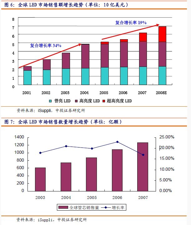 2004年全球LED市場規模為47億美元,Isuppli 預計到2008年將增張到69億美元,年平均增長率約為13%,其中高亮度和超高亮度LED市場年平均增長率將達到20%左右,到2008年二者合計占總體市場份額的三分之二,屆時超高亮度LED單獨的市場規模將達到16億美元。