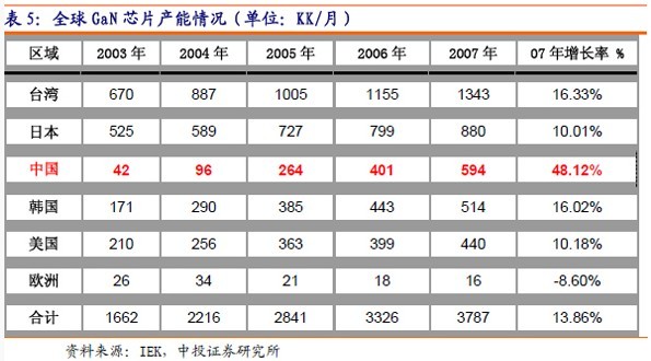 中國大陸芯片產能變化提升較快,是全球GaN芯片產能增加最快的地區。芯片產能的增加一方面來自前幾年所購MOCVD設備經過安裝調試,陸續投入生產,如上海藍寶、廈門三安、大連路明、上海藍光等;另一方面也由于臺灣廠商將部分芯片產能向大陸轉移或臺灣相關人員在大陸投資建廠,加快了國內芯片產能的提高,如廈門明達光電。