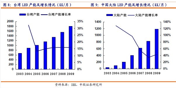 導致價格持續走低的原因,主要是由于上游設備供應商MOVCD外延爐容量的不斷擴大,致使LED外延生產商的單位生產成本下降。