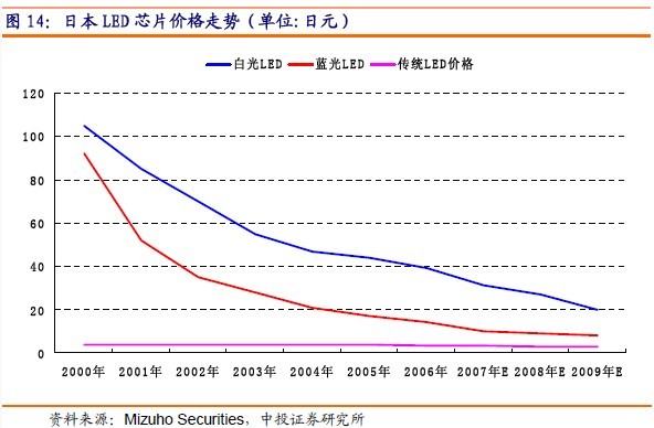 日本LED廠商供應的白光LED價格已從2000年的每顆105日元(約1美元),下跌到2005年的44日元(不到0.5美元)、2009年的20日元;藍光LED價格從2000年的每顆92日元跌至2005年的17日元,預計2009年下降到8日元。預計2008年全年跌幅在10%左右。
