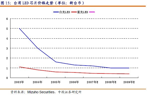 2004年臺灣廠商生產的藍光LED價格跌幅達到30%,2004年底藍光LED報價已跌至新臺幣0.60-0.80元,05年藍光LED的價格跌勢趨緩,全年跌幅在15%。預計08年全年跌幅在10%左右。