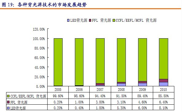 可以看出,從2006年到2008LED背光源的快速成長期。如果按照2010年TFT-LCD市場銷售額950億美元,背光模組占其中20%計算,屆時背光模組的份額約為190億美元。據此推算,LED背光模組份額為15.39億美元,這是比較保守的估計。