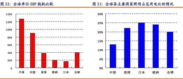 中國政府也已經開始實現照明節能計劃,目標是到2010年每年降低能耗10%。在目前的照明用電占整個用電的比例中,可以看出中國照明用電比例低于全球主要經濟發達國家,也低于全球的平均水平,說明工業用電比例較高,從而使得單位GDP所消耗的能源明顯高于全球平均水平。