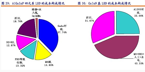 LED外延產品分為四元系和藍光系列兩種,各種產品的成本由于原材料差異而有所不同。