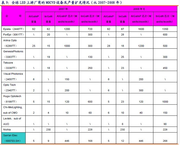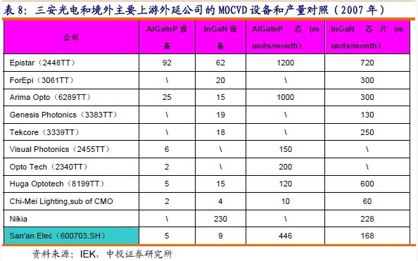 我們以截止2007年底為止,對三安光電和臺灣上游外延廠商的MOCVD設備及外延片、芯片產能進行比較。