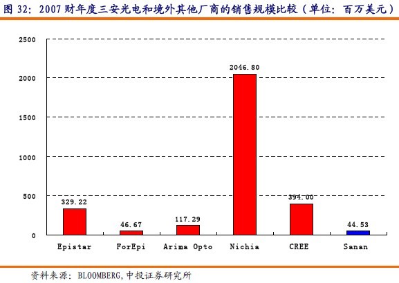 三安光電2007年的銷售規模為44.53百萬美元,其規模和臺灣的璨圓光電規模相當,但和臺灣的晶圓光電、華上光電及美國的CREE公司相比,其銷售規模還有比較大的差距。