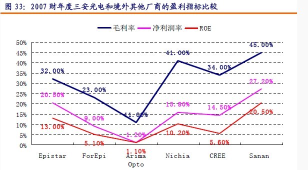從盈利指標來看,2007年度三安光電的銷售毛利率達到45%,凈利潤率達到27.2%,REO為20.50%,遠高于其他國際大廠的盈利指標。其中可能的原因分析來看,國內MOCVD設備折舊年限、國內制造費用先對較低、臺灣廠商進入2008年實行股權、股票、分紅等激勵措施的原因造成國內上游LED廠商的盈利能力平均高于國外廠商。