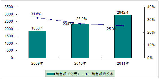 圖3 2009-2011年中國汽車電子市場規(guī)模與增長預(yù)測