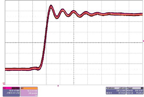 簡單地設(shè)置示波器,重復(fù)觸發(fā)波形,建立波形的余輝地圖,保證波形是重復(fù)的。在這一步時一定要關(guān)閉內(nèi)插。如果波形是重復(fù)的,它將建立一張很緊的余輝地圖。然后,在確定了重復(fù)性之后,您需要高效的采樣率,作為參考給出波形。大多數(shù)高端DSO提供了一種等效時間模式(力科示波器上稱為RIS),可以使用這種模式采集參考曲線。力科DSO還提供了一種處理函數(shù),稱為余輝曲線中間值,它從余輝地圖中提取中間波形。保存參考波形,以備以后比較。如果不能確定怎樣保存參考波形,可以打印余輝視圖,以進(jìn)行比較。