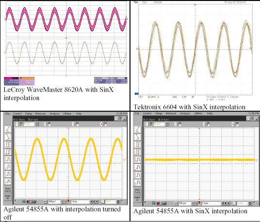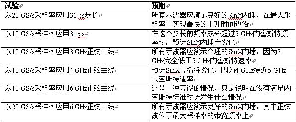 我們使用三種競爭的DSO進(jìn)行簡單的試驗,其分別是力科Wavemaster 8620A、泰克6604和安捷倫54855A。這三種示波器的帶寬指標(biāo)都是6 GHz,最大采樣率是20 GS/s。我們使用六種不同的信號和采樣率組合,說明SinX內(nèi)插算法的性能。