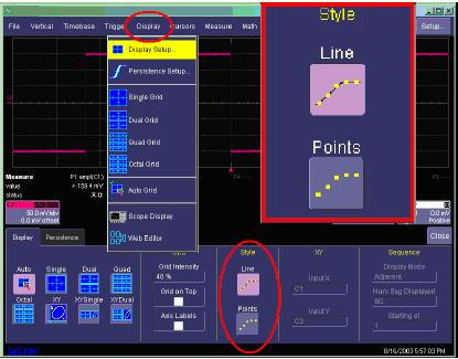 顯示畫面可以設(shè)置成只顯示點或直線。在選擇點時,將只顯示波形點,包括任何內(nèi)插的點。在選擇直線時,會在每個波形點之間畫一條直線,僅包括顯示畫面上內(nèi)插的點。