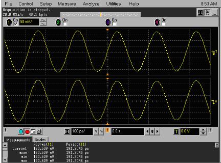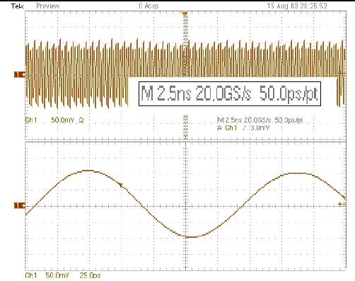 安捷倫示波器,20 GS/s、100 ps/div、啟動SinX內(nèi)插。正弦波看上去很好,測量精度很高。