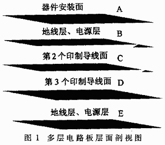 采用多層布線方式,電源、地線和信號分別占有獨立的層面(如圖1所示),這樣由整個層面構成的電源線和接地線阻抗相當低。電路板的分布電容由各層之間的距離和介電系數來決定,約為10~1000pF/cm2。圖1中的E層上下表面經過絕緣處理,既能預防線路板向外輻射噪聲,又能防止線路板接受外來噪聲;同時,電源線被密封在板內,幾乎不接受任何外來噪聲,而且內部幾個供電面之間有很大的靜電電容,形成阻抗極低的供電線路,極大地提高了抗噪性能。