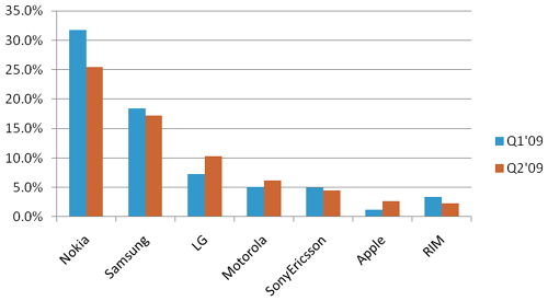 圖二 : 各主要手機(jī)品牌的出貨量市占率(2009年第一季與第二季比較)