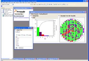 例如,飛思卡爾的工程十分用半導體行業中常見的晶圓圖Wafer Plot來初步分析晶圓的缺陷,以下兩個圖形就是運用JMP軟件繪制而成的。第一張圖顯示的是單個晶圓的質量特征,并配有帕累托圖Pareto Plot展示芯片的良率狀況和各種缺陷出現的頻次。第二張圖則是從整體層面顯示一個批次Lot產品的質量特征(一般來說,飛思卡爾規定25個晶圓組成1個批次)。