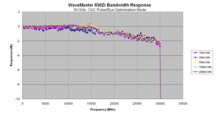 圖二,力科Wavemaster830Zi示波器在不同垂直刻度下的頻響曲線