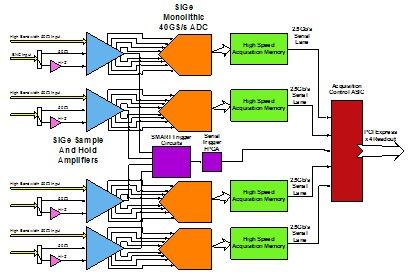 如上圖所示,力科WavePro7Zi及WaveMaster8Zi系列示波器使用了全新的示波器架構,每顆采樣芯片均可提供最高40GS/s的采樣率(如下圖四所示),在最高80GS/s采樣時僅通過兩顆芯片協同工作即可完成。這樣的示波器架構大大簡化了從前端放大器到ADC采樣芯片之間的信號通路,避免了多顆芯片間隔采樣帶來的沖擊電平噪聲,從而很好地保證了高采樣時的信號一致性。