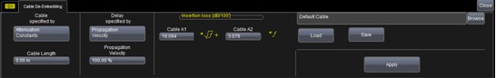 在使用示波器結合同軸電纜測量脈沖信號時,為保證測量的精確性與一致性,必須去除電纜的效應。力科WaveMaster8Zi系列示波器擁有電纜去嵌(cable de-embedding)功能,在每個通道中均可選擇是否激活此功能(下圖所示為cable de-embedding的操作界面)??梢允褂脙煞N方法來輸入電纜的特性:一種是電纜的衰減常數,包括了電纜長度、傳輸速度、插入損耗的多項式系數;另一種是直接輸入多個頻率點的插入損耗(即S參數的S21)。電纜的特性參數可以從電纜廠商處獲得,或者使用TDR或矢量網絡分析儀測量。